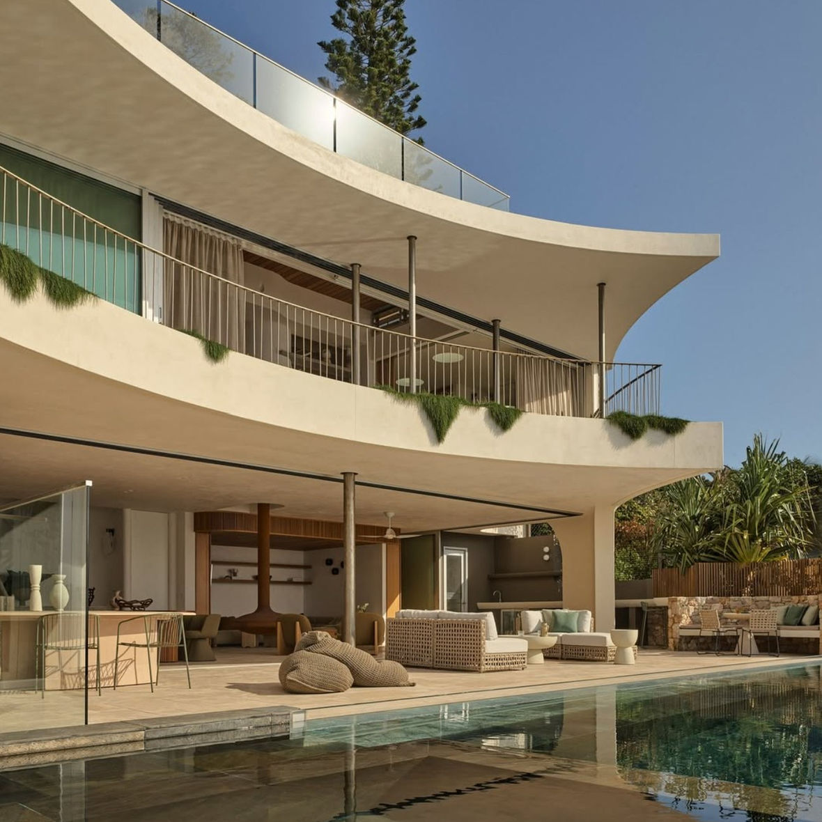 The design harmonises with the stunning beachside environment, offering an elegant blend of modern materiality and natural elements. The spacious interiors are framed by large windows that invite natural light and showcase the breathtaking views of Wategos Beach. High-end finishes and thoughtful design choices create a refined living space that is both functional and aesthetically pleasing.