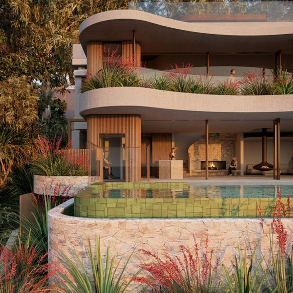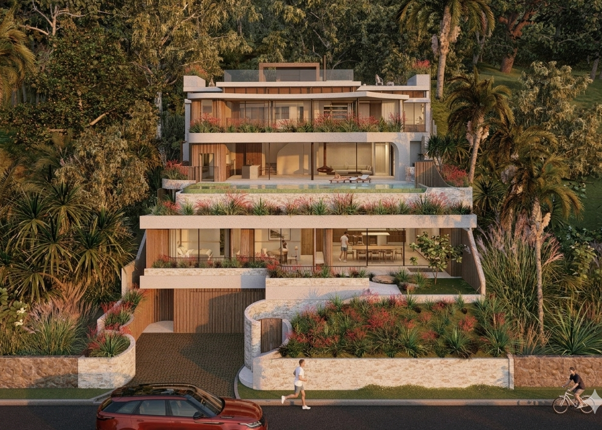 Nestled in the scenic Wategos Beach in Byron Bay, this project is a refined architectural gem that beautifully integrates contemporary design with its natural surroundings. The residence features a striking rendered concrete facade, expansive glazing that captures panoramic views of the coastline, and premium finishes that contribute to a sophisticated and timeless aesthetic.